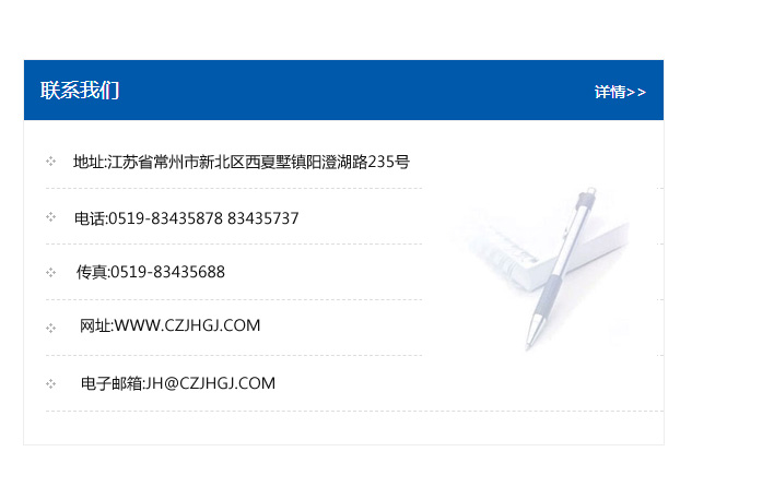 地址:常州市新北區友邦商務大廈1幢16、17層  電話:0519-85101652  傳真:0519-85112595  郵編:213022  網址:www.cz-jiayue_cn.qinpanpan.com  郵箱:xiajifengaa@163.com
